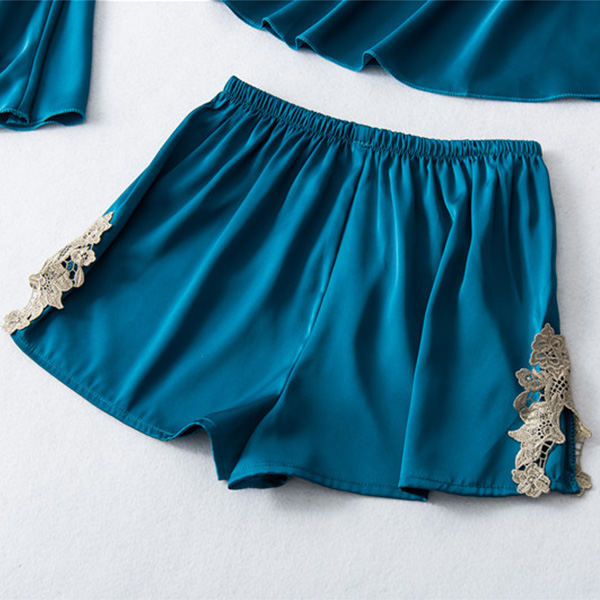 This is a nightwear set which can be fit for your different needs in different seasons. Solid color style,the backless,v-neck and lace spliced design can lend you a dash of sexy and flirty vibes. Including a sling top,a shorts,a sling dress and a long sleeve robe,this nightwear set also can ensure you an utmost comfort with its soft,breathable and smooth fabric.