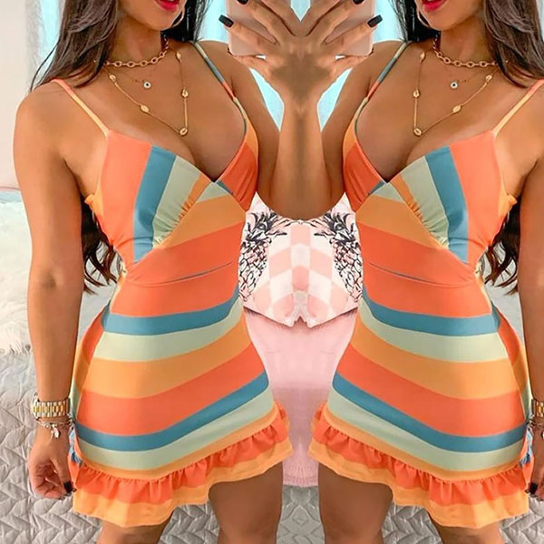 Sexy Backless V-neck Ruffle Hem Colorful Striped Printed Slim Fit Sling Dress