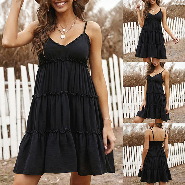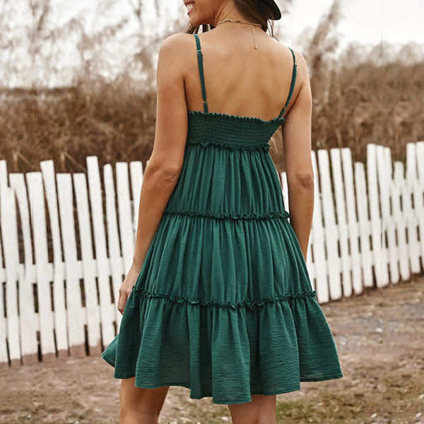 Embrace the summer days with a relaxed piece such as this dress. Solid color tone design makes it look simple yet stylish. Sling style,designed with backless,v-neck and ruffle hem design,this dress not only can exude your charming feminine side,but also can ensure you a cool and comfortable day. Just invite this piece to your summer wardrobe ensemble.