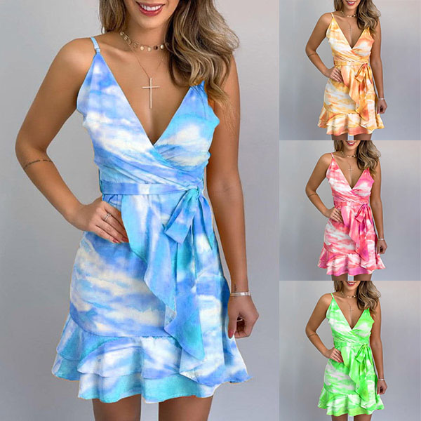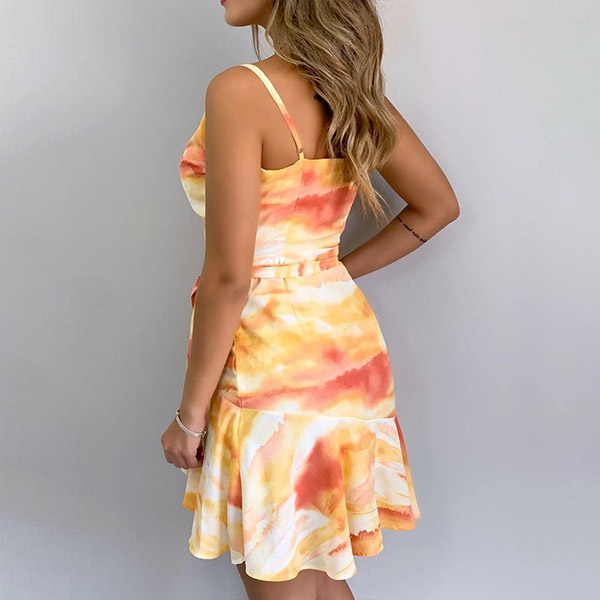 Sexy Backless V-neck Ruffle Hem Tie-dye Printed Sling Dress
