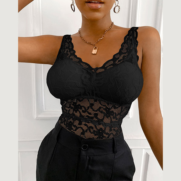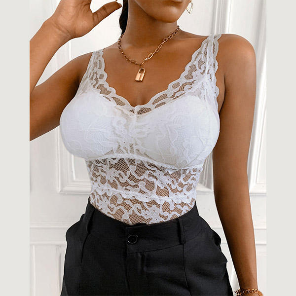 Your beautiful back and charming body-line can have a full display in this lace bra top. Its alluring design details like backless,deep v-neck and see-through lace spliced details make this piece full of flirty and sexy vibes. Designed with detachable chest pad and breathable fabric,this bra tank top is sure to bloom your charm.
