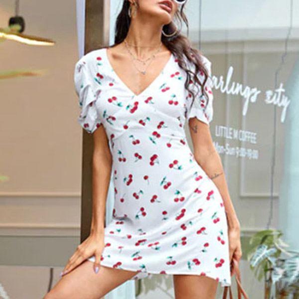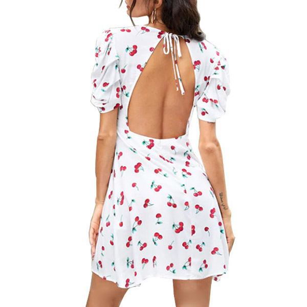 Exhibit your incredible style sense with this beautiful dress. The cherry printed details make it full of fresh and sweet vibes,while the backless and v-neck design will make you look alluring and flirty. You can easily be the focus when you don this dress.