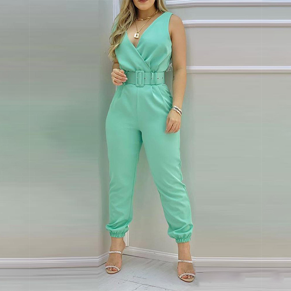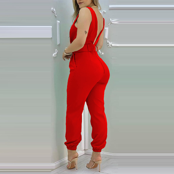 Sexy Backless V-neck Sleeveless High Waist Solid Color Jumpsuit