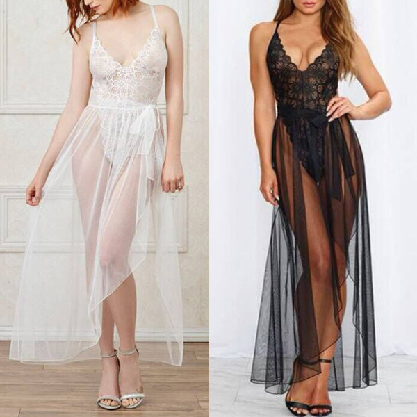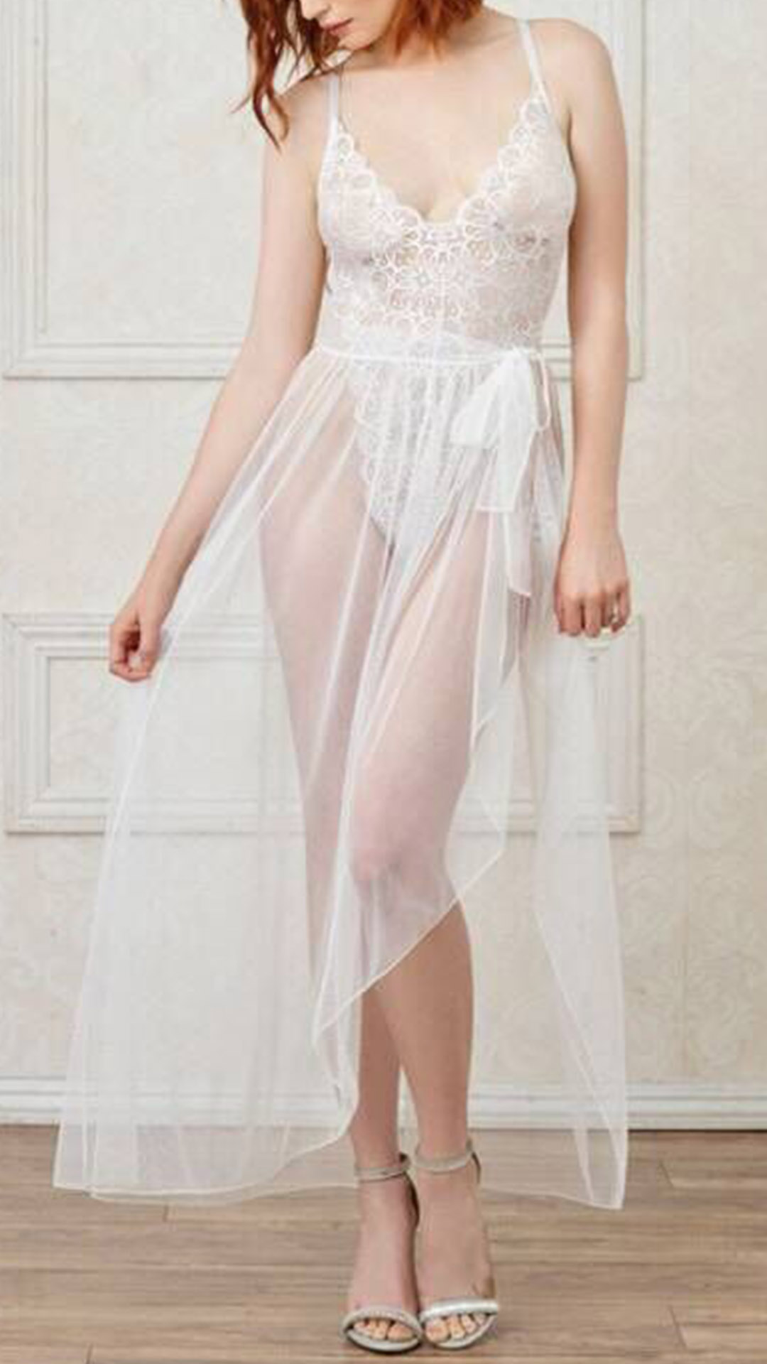It is a good chance to inject a dash of sexy and flirty vibes to your night wardrobe with this lingerie set. It consists of a backless v-neck sling lace bodysuit and a see-through gauze skirt,this lingerie set is a good weapon to express your alluring sense. Don't be shy,just express yourself through this lingerie set!