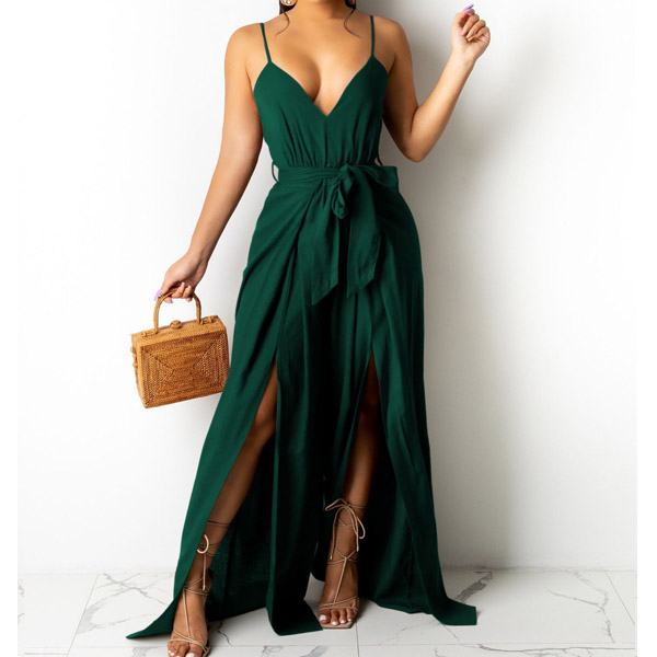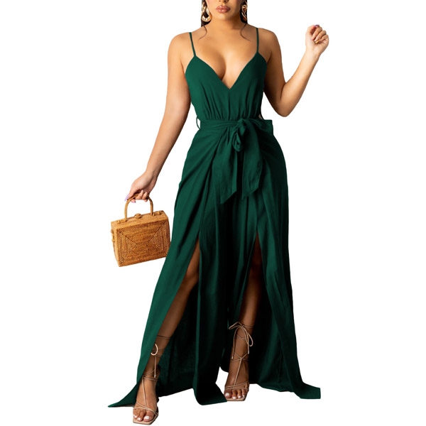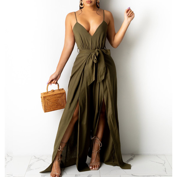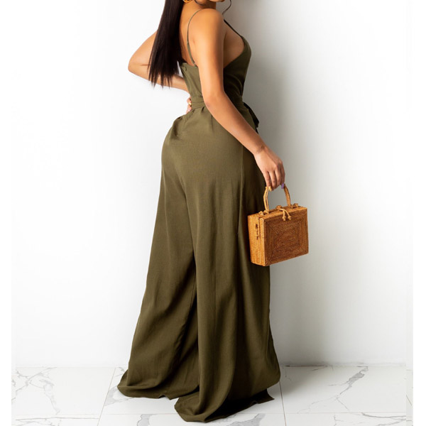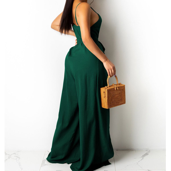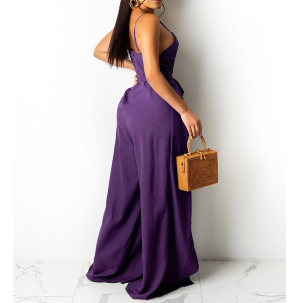 Sexy Backless V-neck Slit Hem High Waist Solid Color Wide-leg Sling Jumpsuit