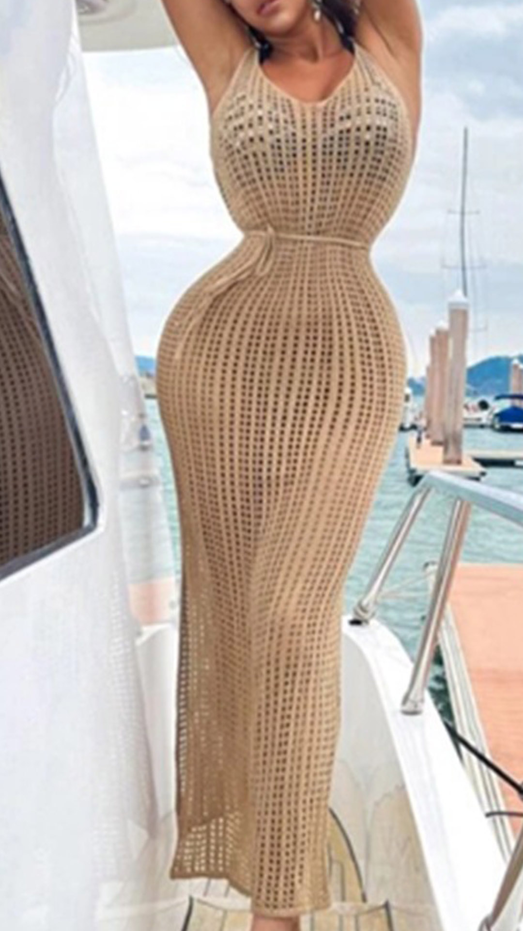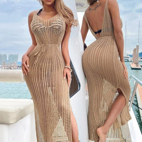 As for a sexy and alluring beach look,you can just have a try this beach dress. Hollow out knit style with backless,v-neck and slit hem design make this piece look so sexy and alluring. When matching with your sexy bikini set,you can easily be a pleasant sight to draw more attention.