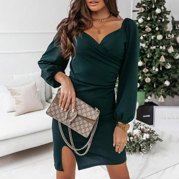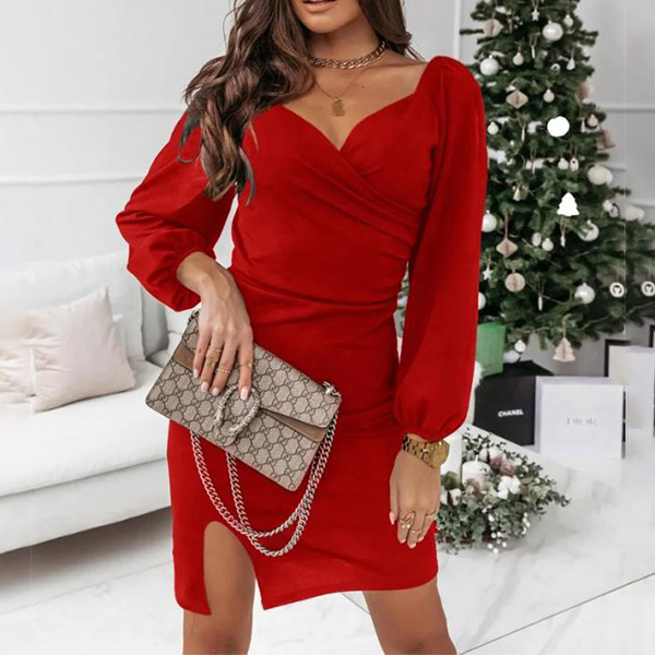 Sexy Backless V-neck Slit Hem Lantern Sleeve Solid Color Slim Fit Dress