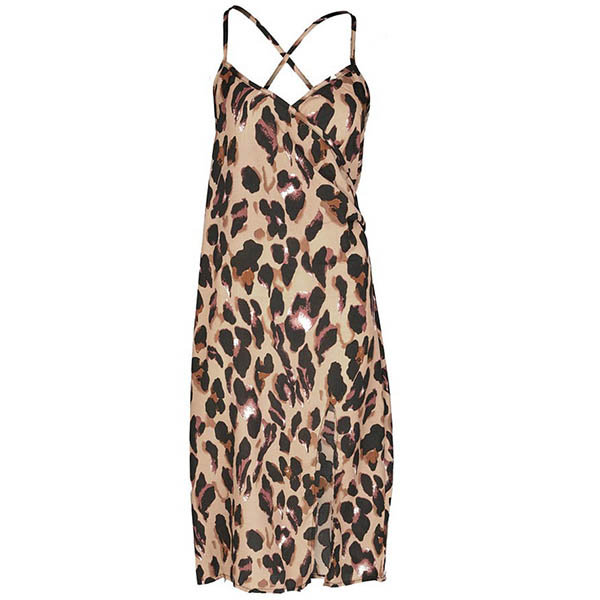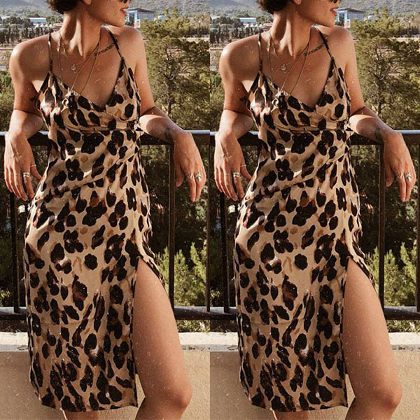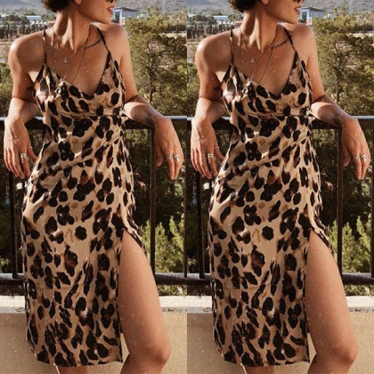 Your style cannot be outmatched when you are wearing this stunning dress. The leopard printed details make this piece look so eye-catching and charming. Sling style,with backless,v-neck and slit hem design,this piece can splash a arouse.