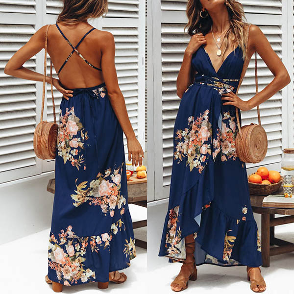 You can easily be a pleasant sight to draw more attention when you wear this printed dress. Sling style,designed with backless,v-neck and slit hem design,this dress can offer you a sexy and alluring look. For your beach days,you can wear this dress and match with your sweet straw hat to achieve for a beautiful look.