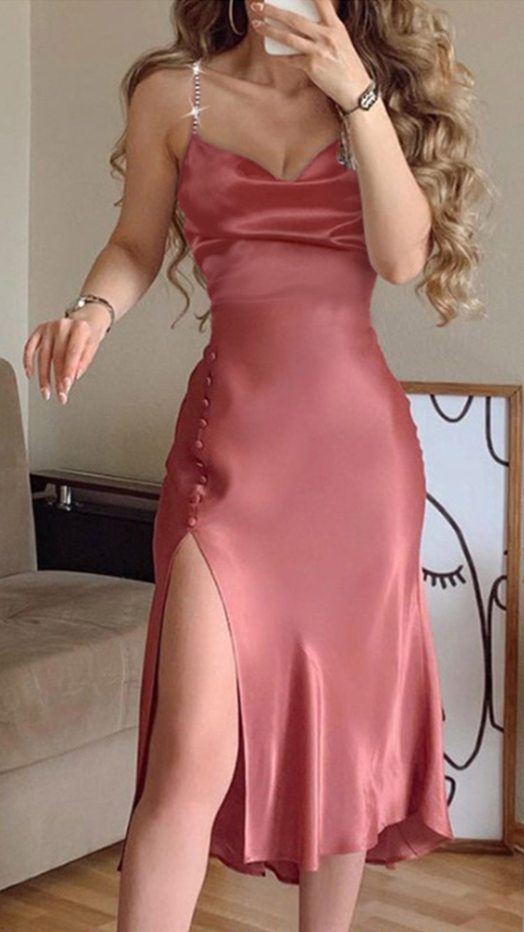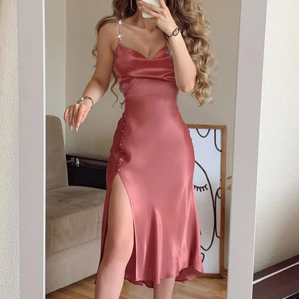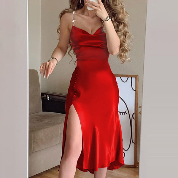 Exhibit your incredible style sense with this beautiful dress. Its alluring design details like backless,v-neck and slit hem design can help you catch more eyes,while the pearl shoulder strap design will make this piece more attractive. For your gatherings and parties,this little stunner can be your wise choice.