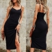 Sexy Backless V-neck Slit Hem Solid Color Slim Fit Sling Dress