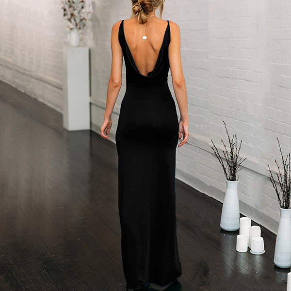 Sexy Backless V-neck Slit Hem Solid Color Slim Fit Sling Party Dress