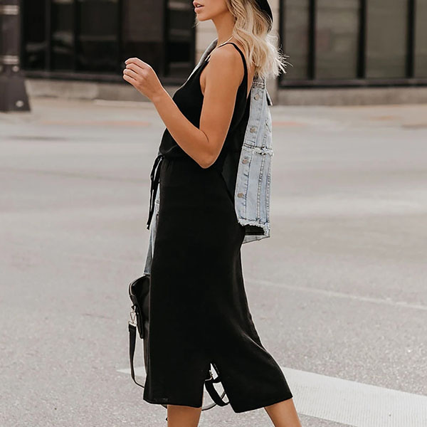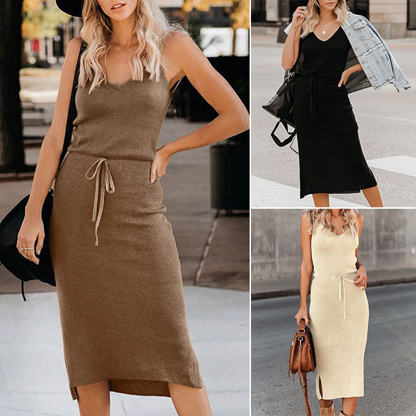 Flutter some hearts when you go out with this knit dress. Sling style,with backless,v-neck and slit hem design,which make this piece look so sexy and alluring. Moreover,the high waist and fit silhouette design will portray your slender figure. You can just slip into this dress to express your beauty and charm.