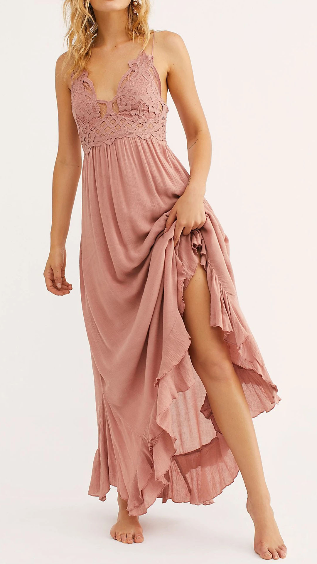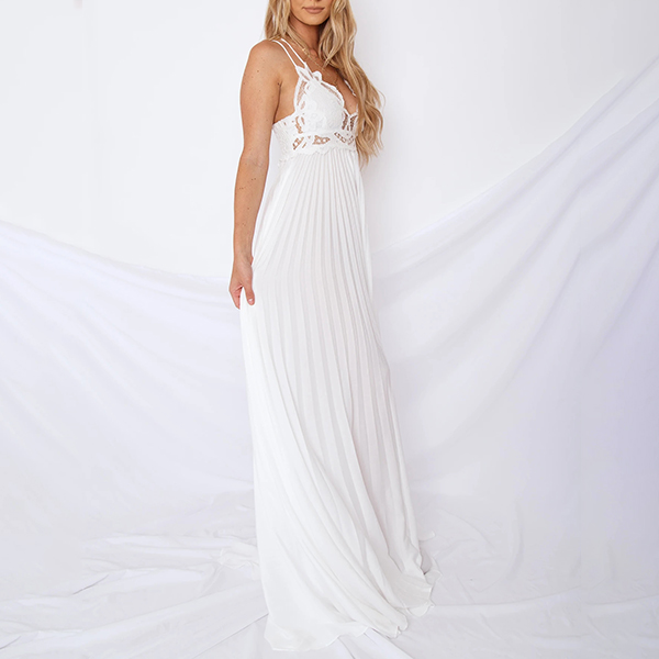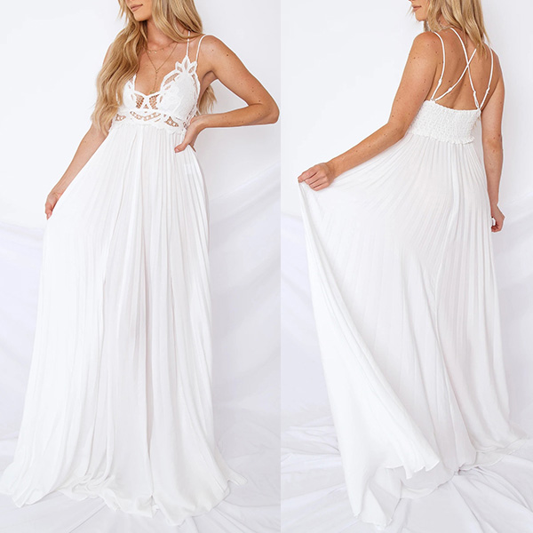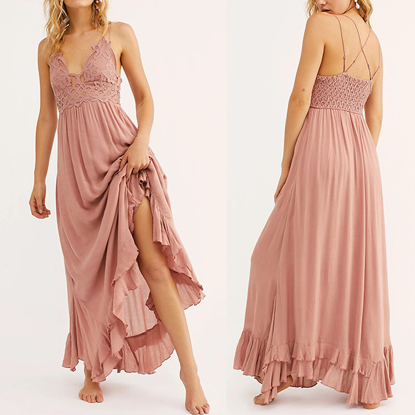 Wow,how could you look so sexy and alluring when you dress yourself up with this little stunner. Sling style,with backless,v-neck,ruffle hem and slit design,these details make this piece look so sexy and alluring. The lace spliced details will help enhance your feminine appeal. For your fancy events,you can trust in this piece to be the focus!