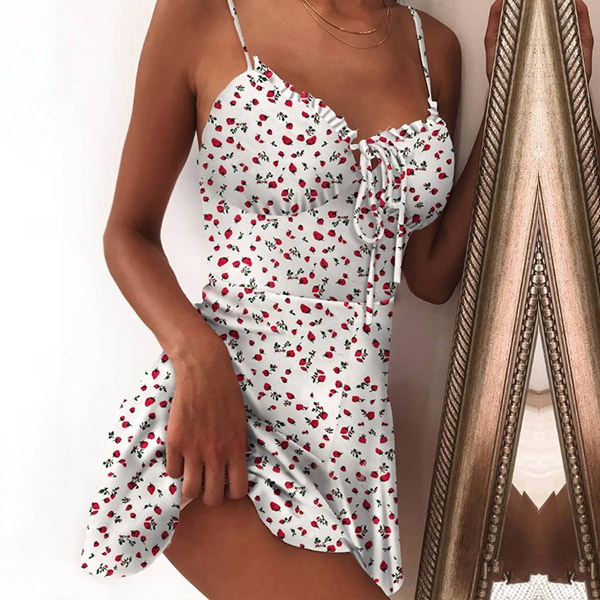 The best way to amplify your sun-soaked weekends is with a dress such as this creation. Sling style,with backless and v-neck design,this dress can easily exude your sexy and feminine side,while the strawberry printed details will make this piece look more playful and eye-catching. Your perfect choice in these summer days.