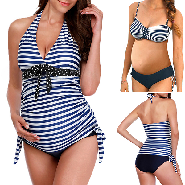 Even you are a pregnant woman,you can enjoy your beach days with this bikini set. The stripe element design makes it look so stylish and attractive. Halter style,with backless and v-neck design,sexy yet flirty. Its soft,quick-dry fabric also can give you a long-lasting comfort. Your perfect choice for your swimming time and beach days.