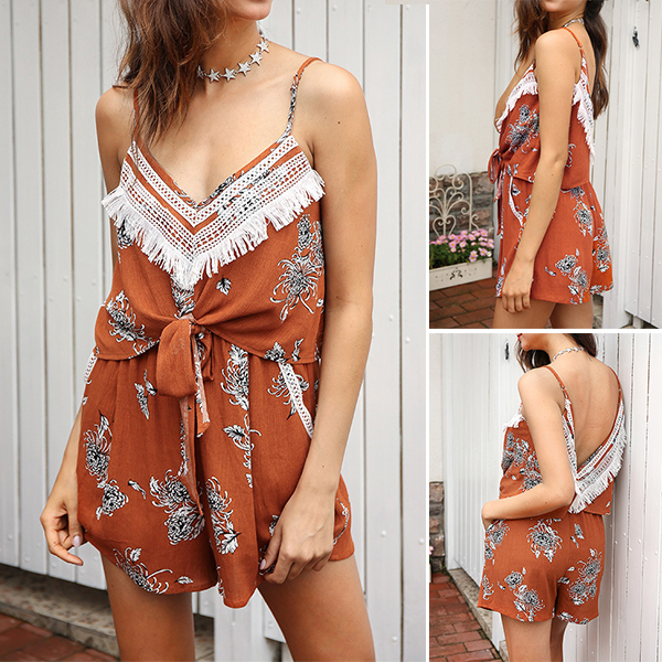 with chic printed pattern for a playful vibe,while its backless,v-neck and tassel spliced details lend you some sexy and