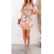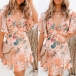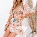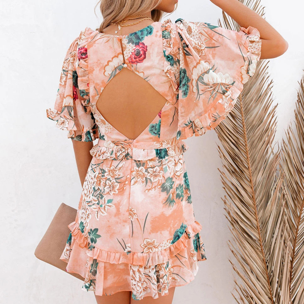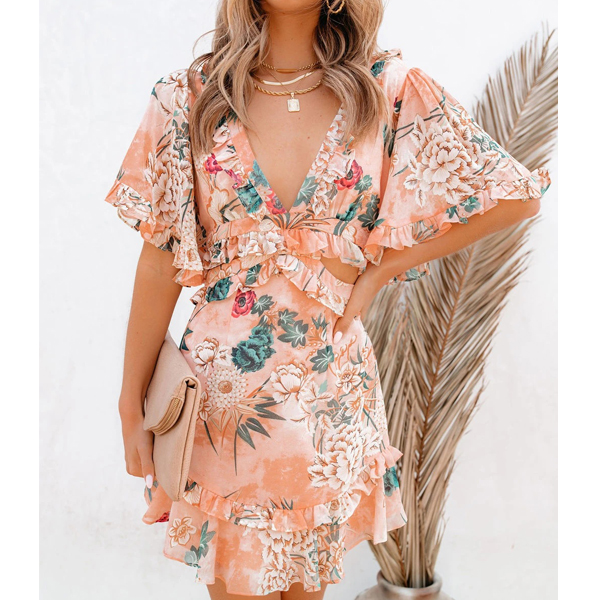 Sexy Bakcless V-neck Lotus Sleeve Ruffle Hem Printed Dress