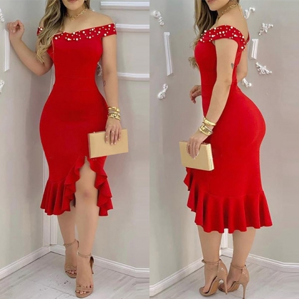 You are sure o be the focus when you don this dress. The bright red tone can lend you some jubilant vibes. What's more,the beaded boat neck and irregular ruffle hem design will offer you a more alluring look. When matching with your sexy heels and sexy heels,you can look stunning enough!