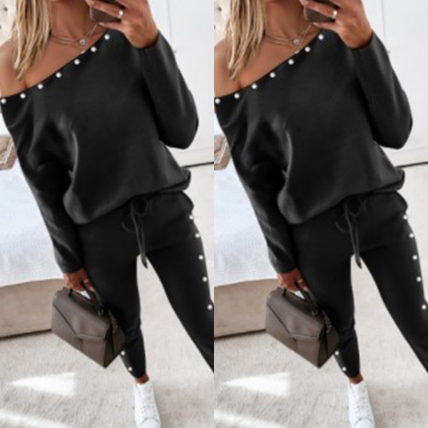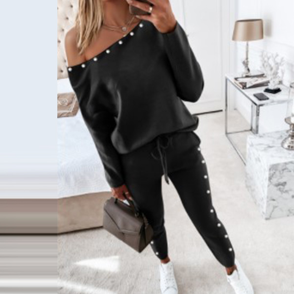 Sexy Beaded Oblique Shoulder Long Sleeve Sweatshirt + Pants Two-piece Set