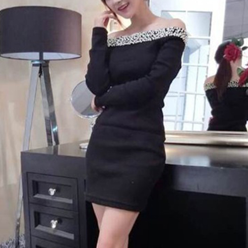 a sexy slash neck,decorated with beaded making it look more glamorous. And its fit silhouette can