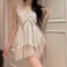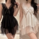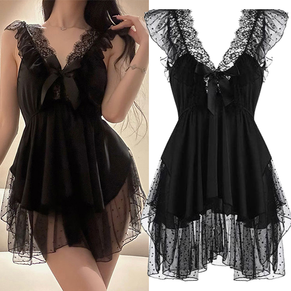 Sexy Black Lace Spliced Back-tie Ruffle Two-piece Loungewear Nightwear Set