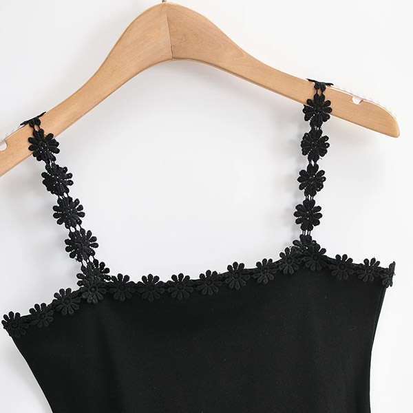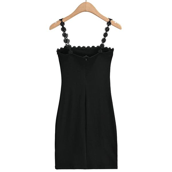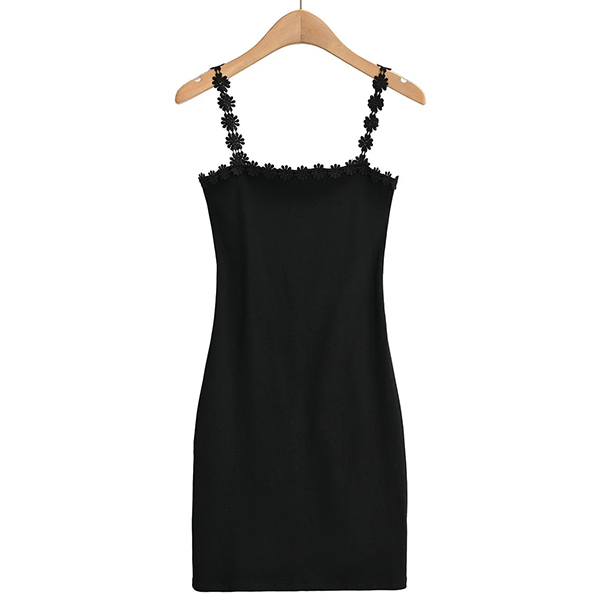 Short, fitted dress with narrow lace shoulder straps. Zipper at back.