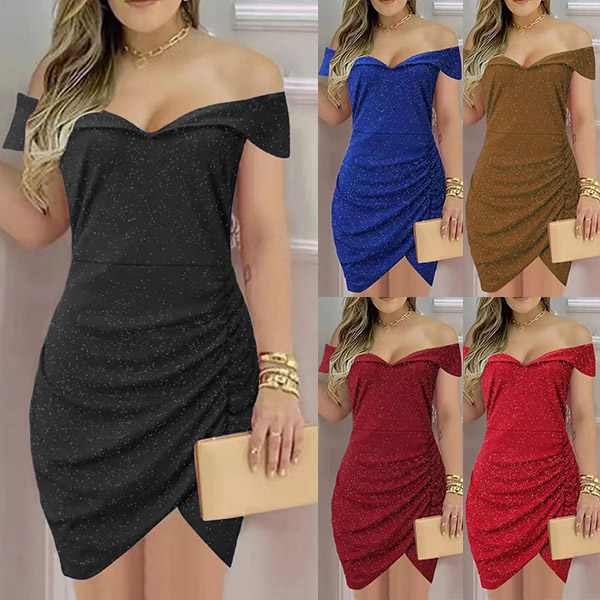 This bodycon dress comes with off-the-shoulder, side gathered, and irregular hemline. The bling-bling design adds some sexy vibe to it. For party wear, it would be a good choice.