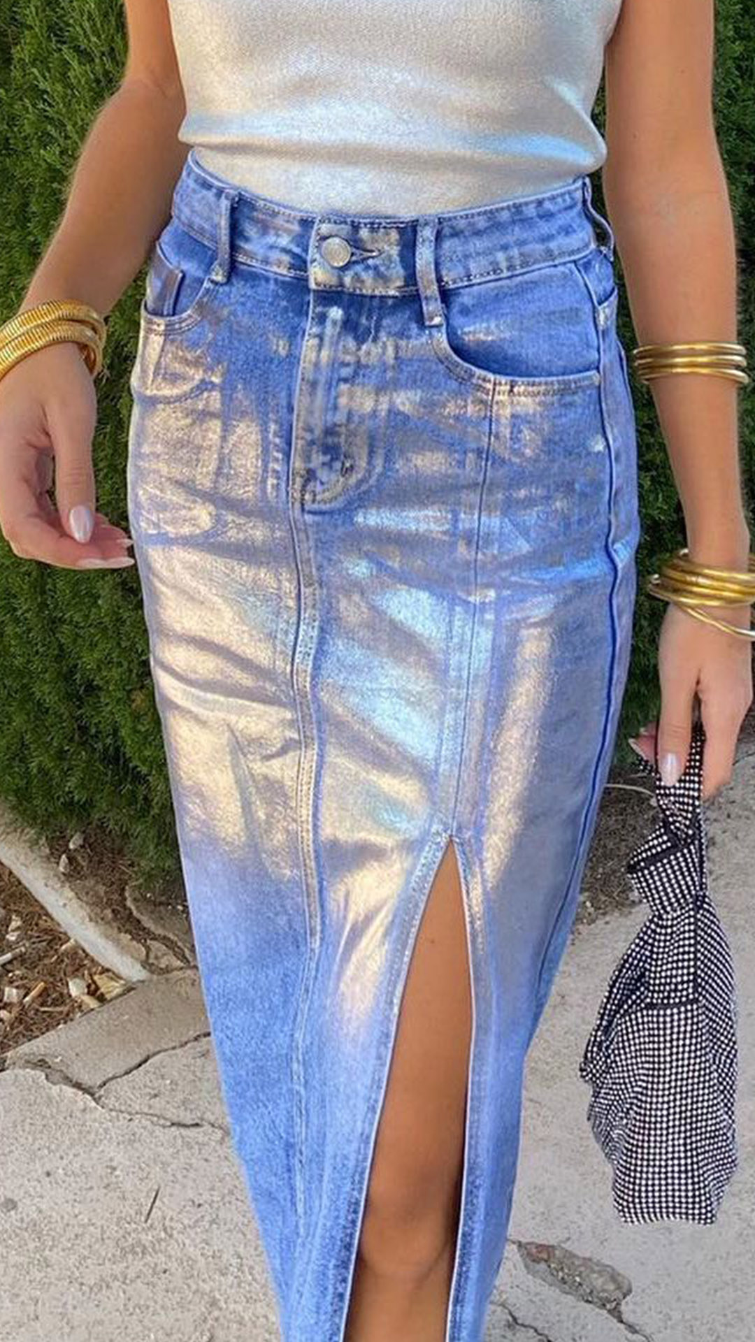 Sexy Bling-bling Gold Metallic Washed Slit Denim Skirt