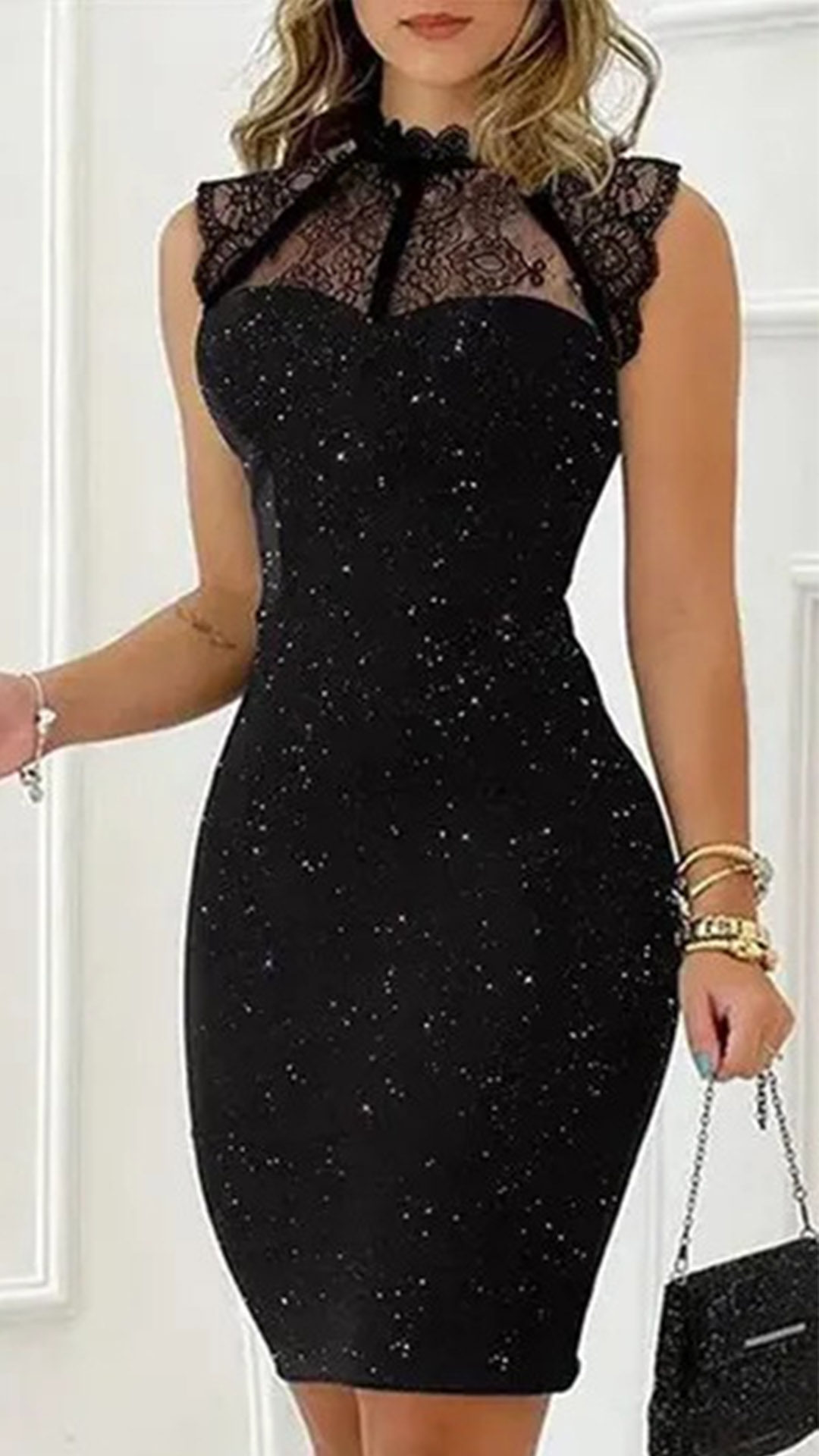 Sexy Bling-bling Lace Spliced Mock Neck Sleeveless Backless Bodycon Dress