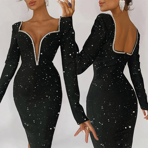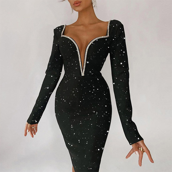 Sexy Bling-bling Rhinestone Plunge V-neck Bodycon Party Dress