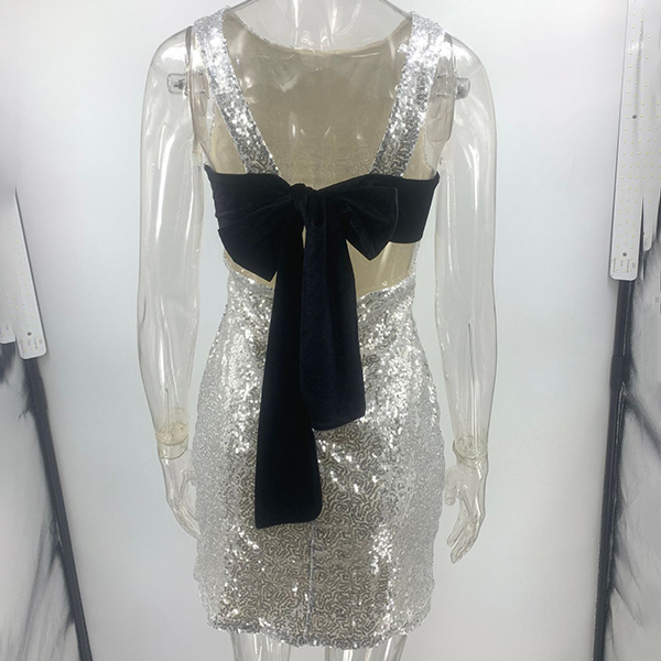Sexy Bling-bling Sequin Crew Neck Sleeveless Backless Bowknot Mini Dress