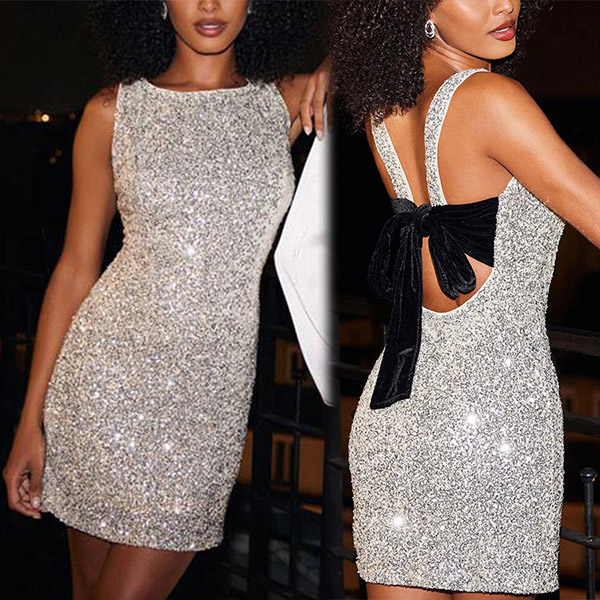 This sexy party dress features a crew neckline, sleeveless design, bling-bling sequin detailing, backless silhouette with a stylish bowknot accent! It is perfect for next party wear.