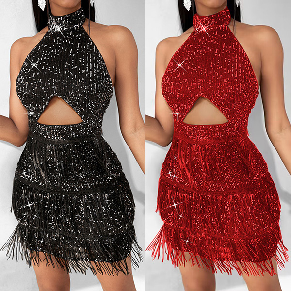 Sexy Bling-bling Sequin Halter Neck Sleeveless Front Cutout Backless Tassel Party Dress