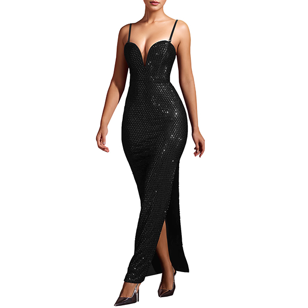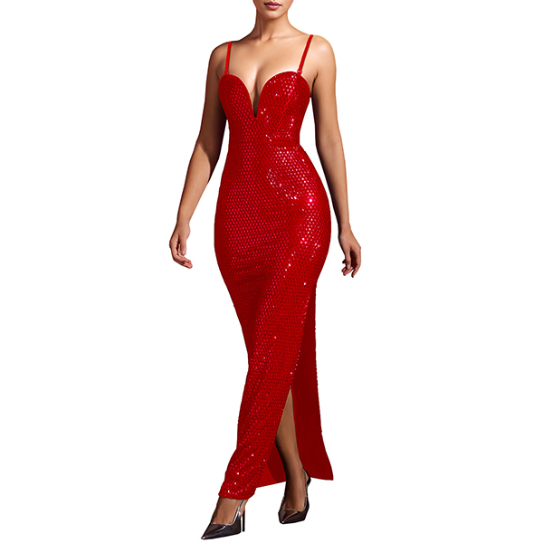 This is a glamorous and eye-catching party dress that features bling-bling sequins, a sweetheart neckline, side slit, and a maxi length for a show-stopping and elegant look.