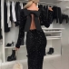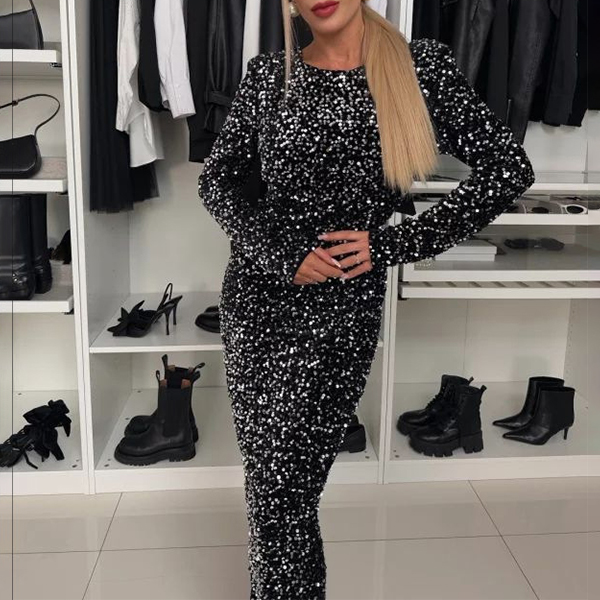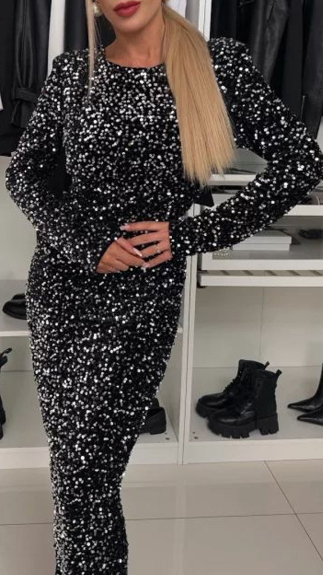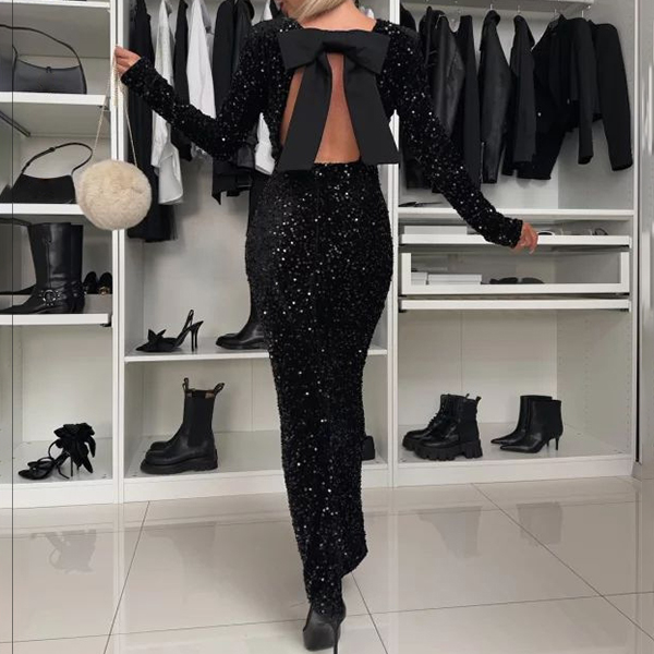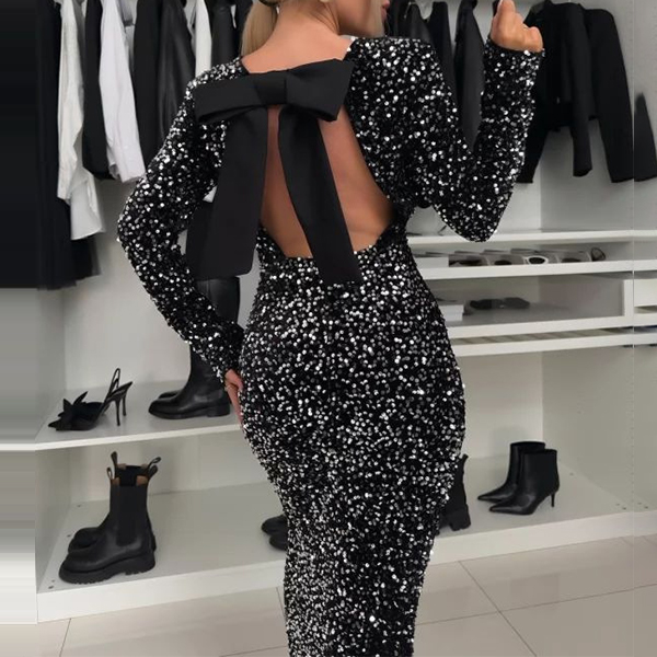 This chic dress adorned with bling-bling sequins. It features a crew neckline, long sleeves, a backless design with stylish bowknot accent, and a figure-hugging bodycon silhouette that exudes confidence and elegance. Perfect for party wear!