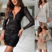 Sexy Bling-bling Sequined Gauze Spliced V-neck Long Sleeve Bodycon Party Dress