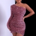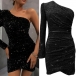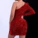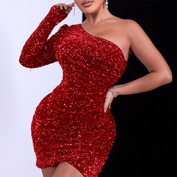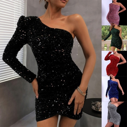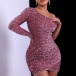 Sexy Bling-bling Sequined One-shoulder Long Sleeve Irregular Hemline Bodycon Party Dress