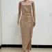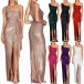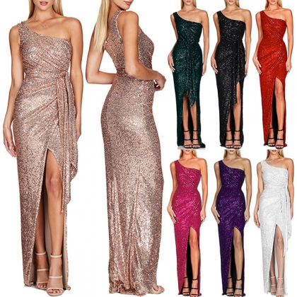 Sexy Bling-bling Sequined Slant Shoulder Sleeveless Self-tie Slit Maxi Party Dress