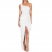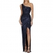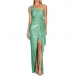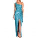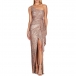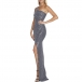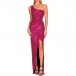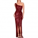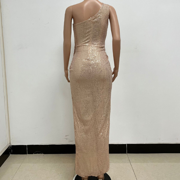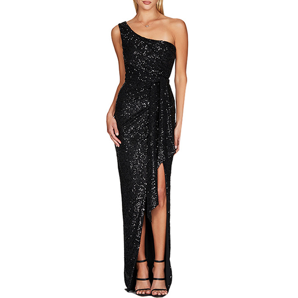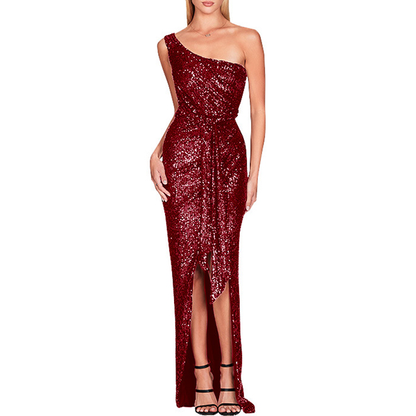 This is a glamorous and show-stopping piece that features bling-bling sequins, a slant shoulder design, sleeveless silhouette, self-tie waist detail, and a thigh-high slit for a stunning and elegant look. This dress is perfect for those who want to make a bold and sophisticated entrance at any party or special occasion.