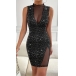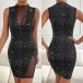 Sexy Bling-bling Sequined Spliced Semi-through Gauze Mock neck Sleeveless Bodycon Party Dress