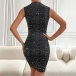 This glamorous party dress features a stunning bling-bling sequined design spliced with semi-sheer gauze for a sophisticated and alluring touch. The mock neck and sleeveless bodycon silhouette enhance your curves, making it perfect for turning heads at any event. Pair it with strappy heels and minimal accessories for a dazzling party look!