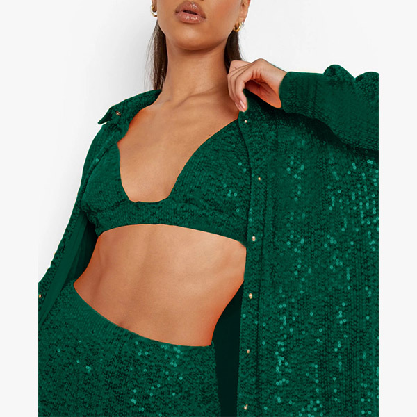 This stunning set is perfect for those who want to make a bold and glamorous statement. The set consists of a brassiere, a zipper jacket, and straight pants, all adorned with dazzling sequins. Whether you’re heading to a party or a special event, this three-piece set is sure to turn heads and make you feel confident and glamorous.