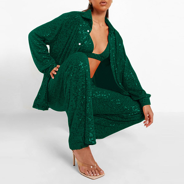 Sexy Bling-bling Sequined Three-piece Set Consist of Brassiere, Zipper Jacket, and Straight Pants