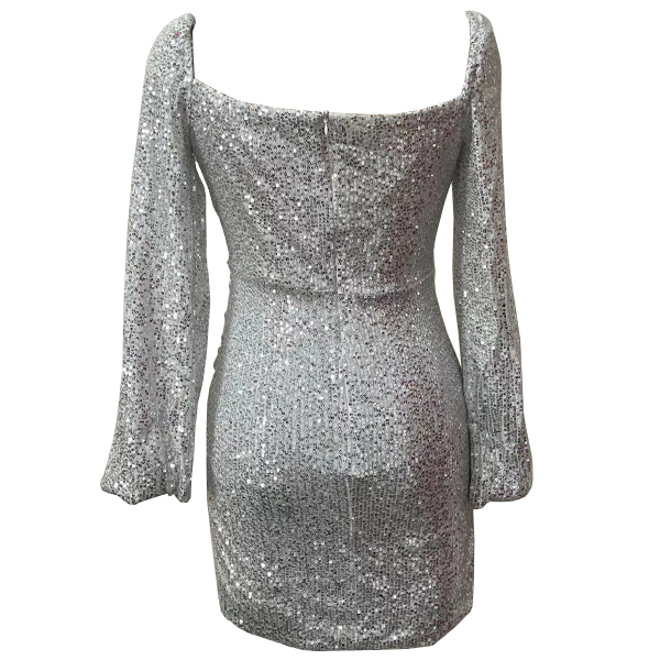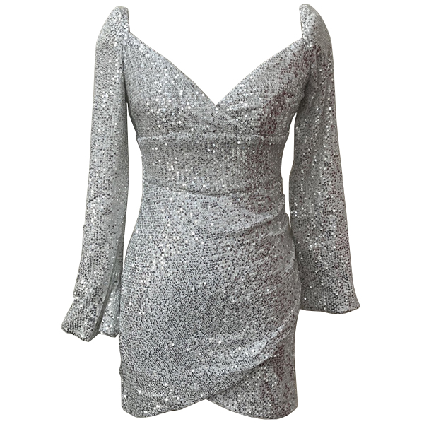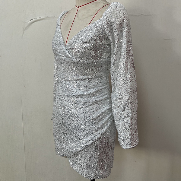 This stunning dress features a V-neckline that adds a touch of allure and sophistication to your look. The long sleeves provide coverage while the sequined detailing adds a dazzling and eye-catching element. The irregular hemline creates a unique and stylish silhouette, perfect for a party or special event.