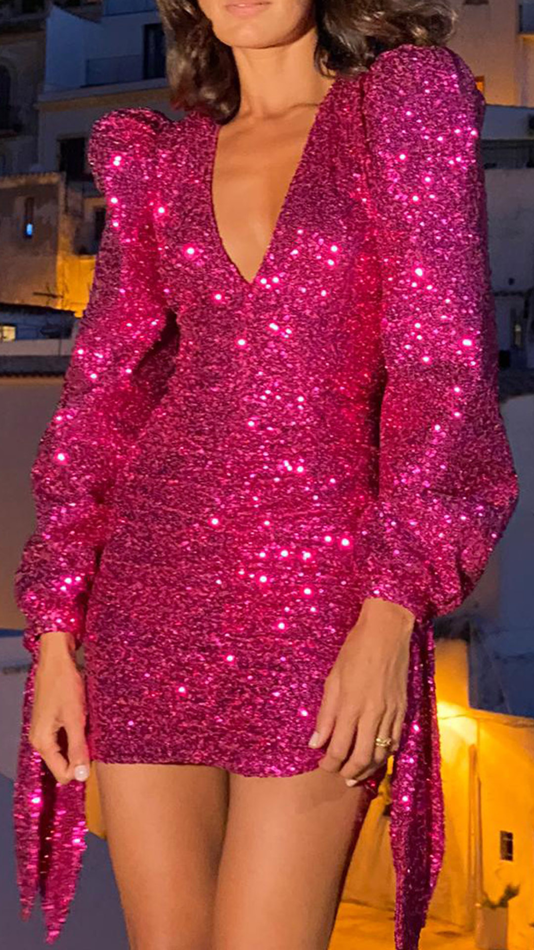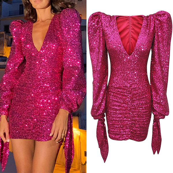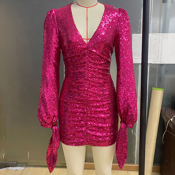 How about this party dress? It features a deep V-neckline, long sleeves with self-tie cuff, and a bodycon silhouette that hugs your curves in all the right places. The ruched detailing and sequin embellishments add a touch of sparkle and glamour. Whether you're attending a wedding, a cocktail party, or a night out, this dress will ensure you look and feel your best.