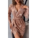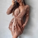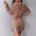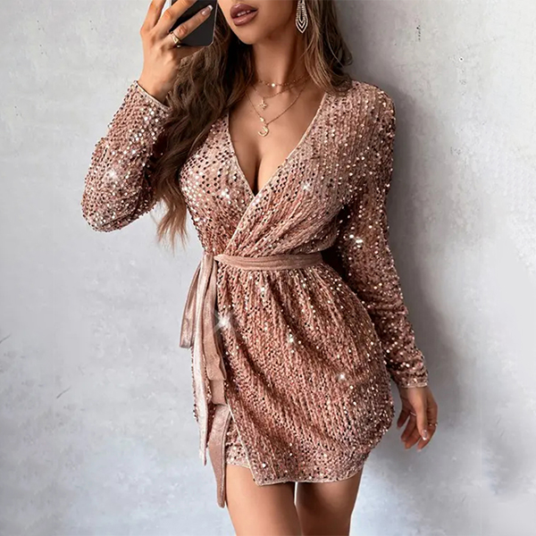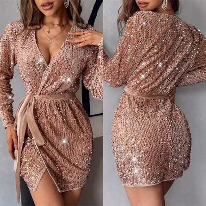 Sexy Bling-bling Sequined V-neck Long Sleeve Side Slit Self-tie Bodycon Party Dress