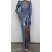This dress features a dazzling sequined fabric, a flattering V-neckline, dramatic puff sleeves, a front slit, and a maxi length for a stunning and head-turning look. It is a show-stopping option for any party or special event.