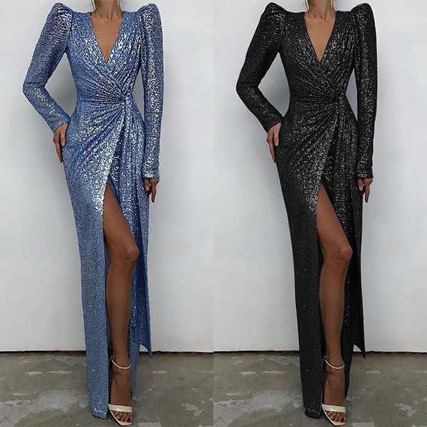 Sexy Bling-bling Sequined V-neck Puff Long Sleeve Front Slit Maxi Party Dress