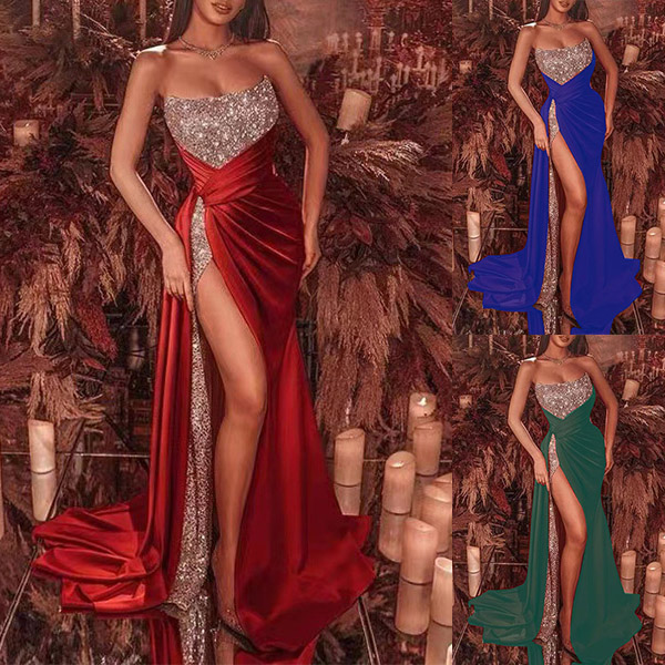 This is a glamorous and attention-grabbing party dress that combines a strapless design, high slit, and bling-bling spliced detailing for a seductive and eye-catching look. Pair it with strappy heels and statement jewelry for a complete and show-stopping ensemble.